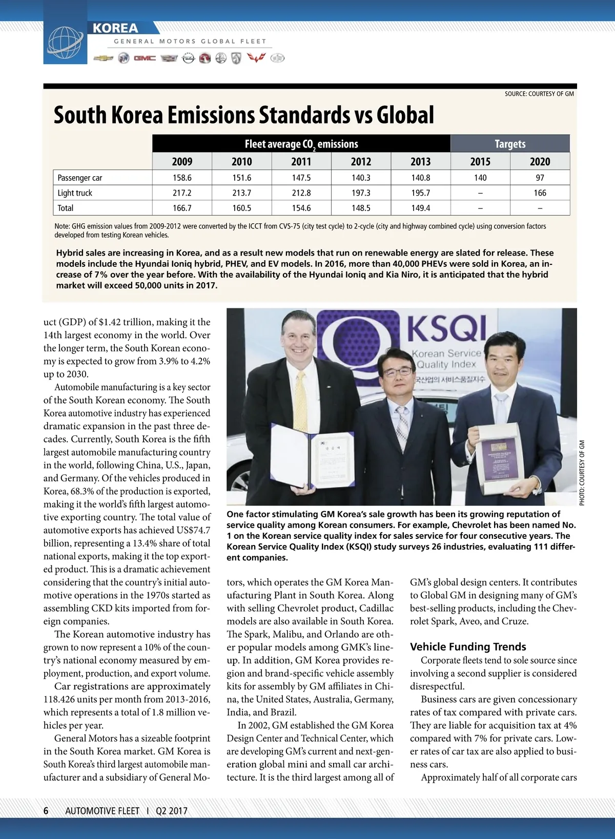 KOREA SOURCE: COURTESY OF GM South Korea Emissions Standards vs Global 2009 Passenger car Light truck Total 158.6 217.2 166.7 Fleet average CO 2 emissions 2010 2011 2012 151.6 213.7 160.5 147.5 212.8 154.6 140.3 197.3 148.5 Targets 2013 140.8 195.7 149.4 2015 140 – – 2020 97 166 – Note: GHG emission values from 2009-2012 were converted by the ICCT from CVS-75 (city test cycle) to 2-cycle (city and highway combined cycle) using conversion factors developed from testing Korean vehicles. Hybrid sales are increasing in Korea, and as a result new models that run on renewable energy are slated for release. These models include the Hyundai Ioniq hybrid, PHEV, and EV models. In 2016, more than 40,000 PHEVs were sold in Korea, an in-crease of 7% over the year before. With the availability of the Hyundai Ioniq and Kia Niro, it is anticipated that the hybrid market will exceed 50,000 units in 2017. uct (GDP) of $1.42 trillion, making it the 14th largest economy in the world. Over the longer term, the South Korean econo-my is expected to grow from 3.9% to 4.2% up to 2030. Automobile manufacturing is a key sector of the South Korean economy. he South Korea automotive industry has experienced dramatic expansion in the past three de-cades. Currently, South Korea is the ith largest automobile manufacturing country in the world, following China, U.S., Japan, and Germany. Of the vehicles produced in Korea, 68.3% of the production is exported, making it the world’s ith largest automo-tive exporting country. he total value of automotive exports has achieved US$74.7 billion, representing a 13.4% share of total national exports, making it the top export-ed product. his is a dramatic achievement considering that the country’s initial auto-motive operations in the 1970s started as assembling CKD kits imported from for-eign companies. he Korean automotive industry has grown to now represent a 10% of the coun-try’s national economy measured by em-ployment, production, and export volume. Car registrations are approximately 118.426 units per month from 2013-2016, which represents a total of 1.8 million ve-hicles per year. General Motors has a sizeable footprint in the South Korea market. GM Korea is South Korea’s third largest automobile man-ufacturer and a subsidiary of General Mo-6 AUTOMOTIVE FLEET I Q2 2017 One factor stimulating GM Korea’s sale growth has been its growing reputation of service quality among Korean consumers. For example, Chevrolet has been named No. 1 on the Korean service quality index for sales service for four consecutive years. The Korean Service Quality Index (KSQI) study surveys 26 industries, evaluating 111 differ-ent companies. tors, which operates the GM Korea Man-ufacturing Plant in South Korea. Along with selling Chevrolet product, Cadillac models are also available in South Korea. he Spark, Malibu, and Orlando are oth-er popular models among GMK’s line-up. In addition, GM Korea provides re-gion and brand-speciic vehicle assembly kits for assembly by GM ailiates in Chi-na, the United States, Australia, Germany, India, and Brazil. In 2002, GM established the GM Korea Design Center and Technical Center, which are developing GM’s current and next-gen-eration global mini and small car archi-tecture. It is the third largest among all of GM’s global design centers. It contributes to Global GM in designing many of GM’s best-selling products, including the Chev-rolet Spark, Aveo, and Cruze. Vehicle Funding Trends Corporate leets tend to sole source since involving a second supplier is considered disrespectful. Business cars are given concessionary rates of tax compared with private cars. hey are liable for acquisition tax at 4% compared with 7% for private cars. Low-er rates of car tax are also applied to busi-ness cars. Approximately half of all corporate cars PHOTO: COURTESY OF GM